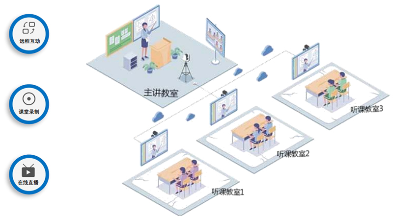 各課室建設(shè)錄播主機,實現(xiàn)課堂師生畫面跟蹤,音視頻錄制、在線直播、點播。系統(tǒng)實現(xiàn)在授課過程中,本地教室與遠(yuǎn)程聽課教室之間的同步授課,以及實時音視頻互動交流;诱n程能夠同步錄制,真實展現(xiàn)互動教學(xué)場景。積極推動“一校帶多點”、“一校帶多校”的教學(xué)和教研組織模式,逐步使依托信息技術(shù)的“優(yōu)質(zhì)學(xué)校帶薄弱學(xué)校、優(yōu)秀教師帶普通教室”模式制度化。